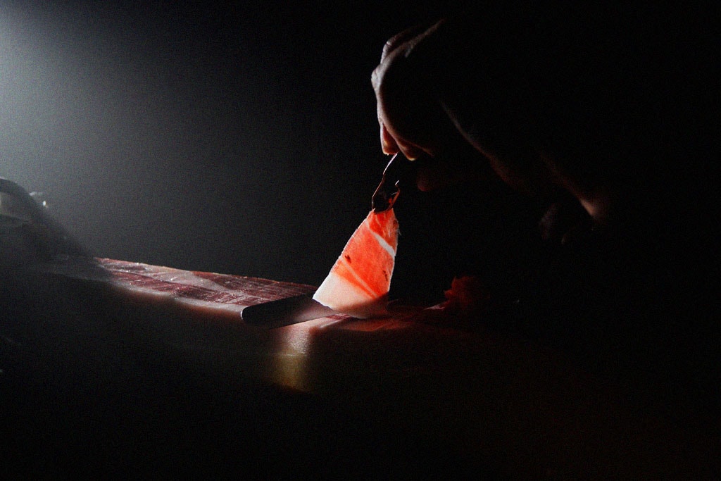 - Conservar las primeras lonchas de grasa (blanca, no amarilla) y colocarlas sobre la carne al terminar de cortar.